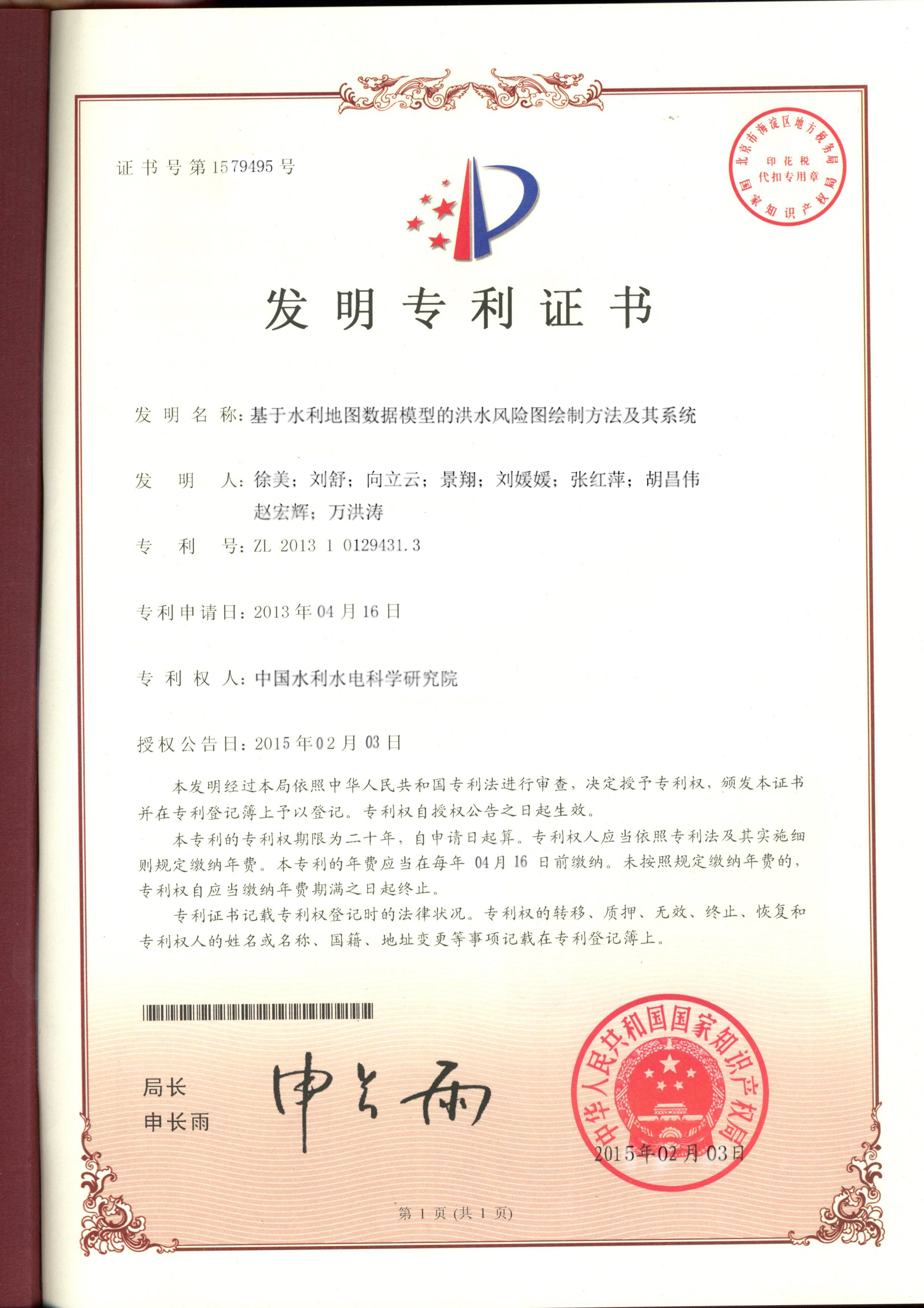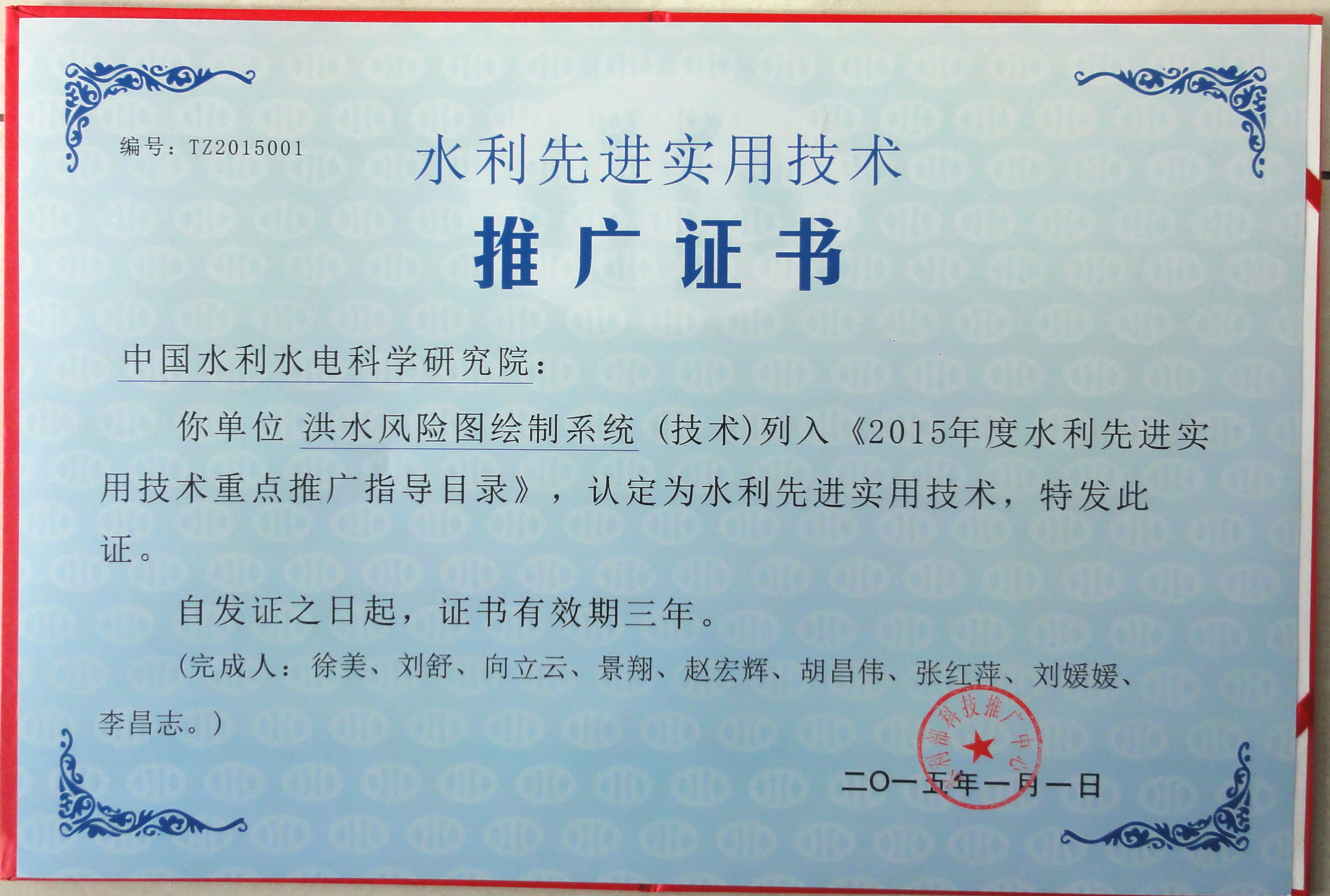 FMAP既是“全国洪水风险图编制试点二期”项目的主要研究成果之一,同时也支撑了试点二期项目中三十多个重点防洪保护区和国家级重点蓄滞洪区洪水风险图的绘制工作,七大流域委作为风险图编制的主要部门,利用本成果中完成了各流域范围内风险图成果的绘制。本系统列入水利部2015年技术推广应用目录(图5),并成功申请了国家发明专利(图6)。