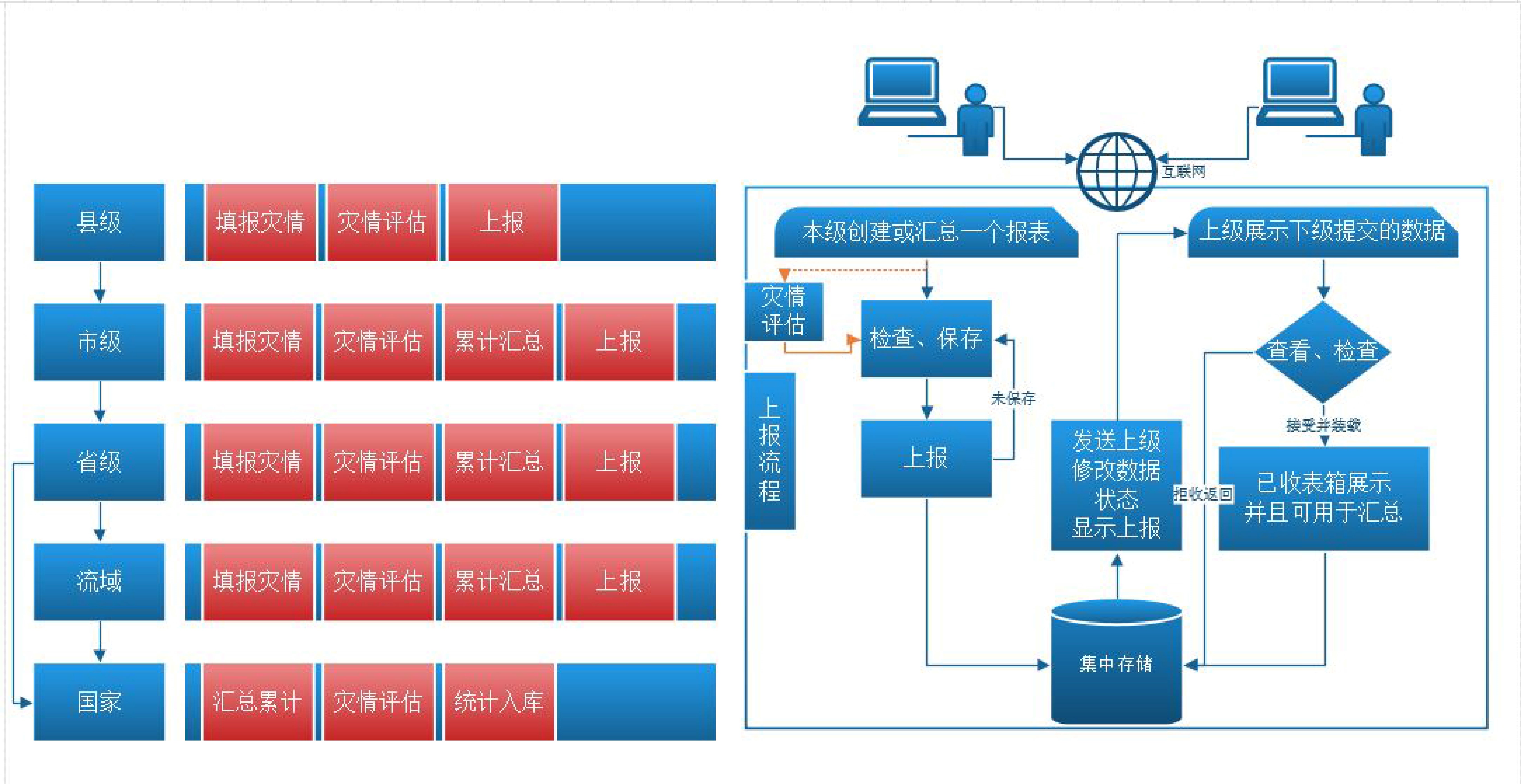 以县、市、省、流域、国家为顺序,各级填报人员基于互联网实现逐级填写、审核、自动检查、报送、汇总等功能。数据集中存储管理,方便检索查询和共享分发,并且有利于保护数据安全和完整一致。