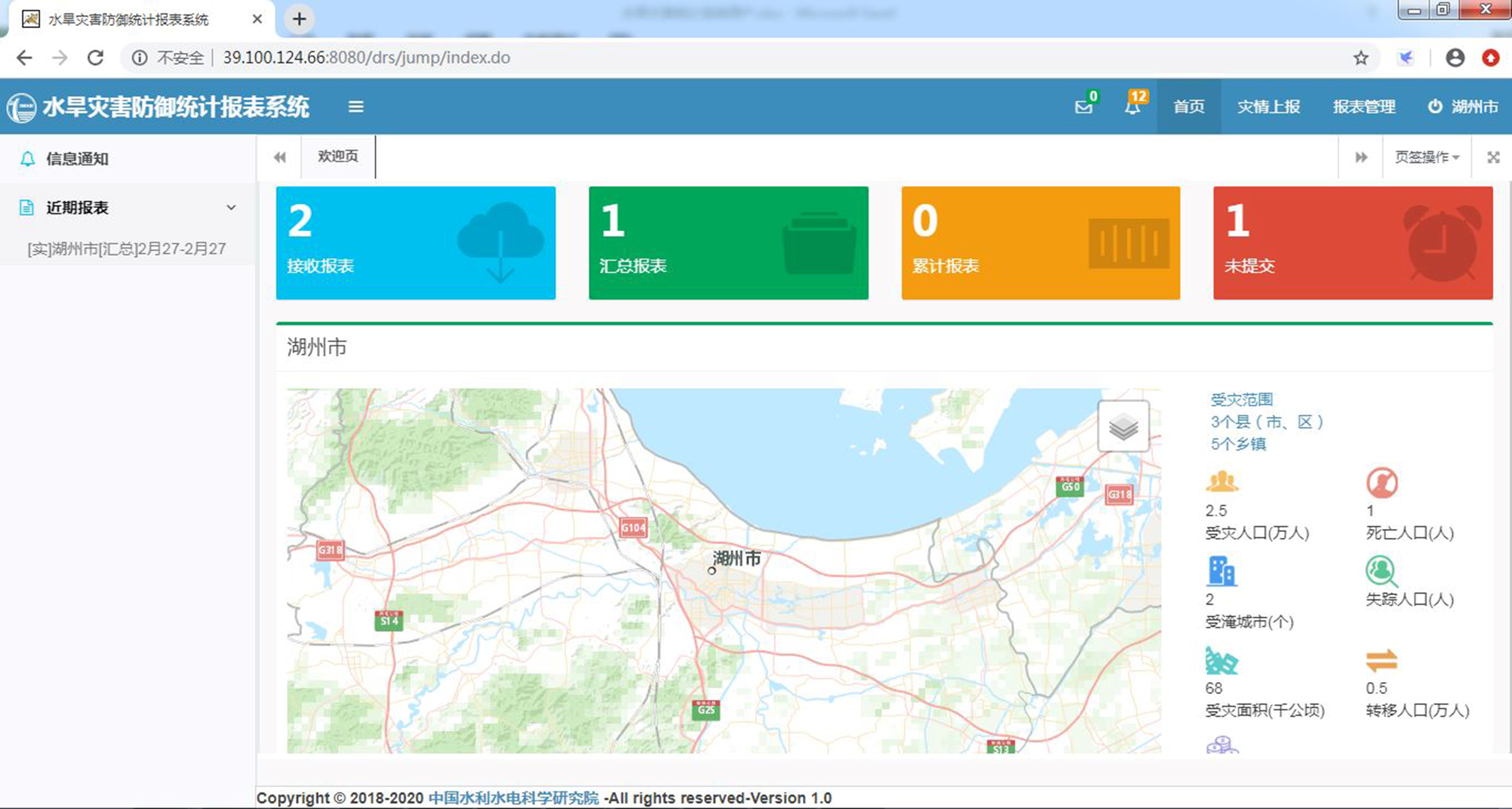 用户登录系统后可以快速查询检索本级单位最新报表,以及本级单位报表情况信息,接收提示信息,并快速跳转到对应功能进行报表操作。基于电子地图展示最新的水旱灾害分布和灾害影响统计信息。
