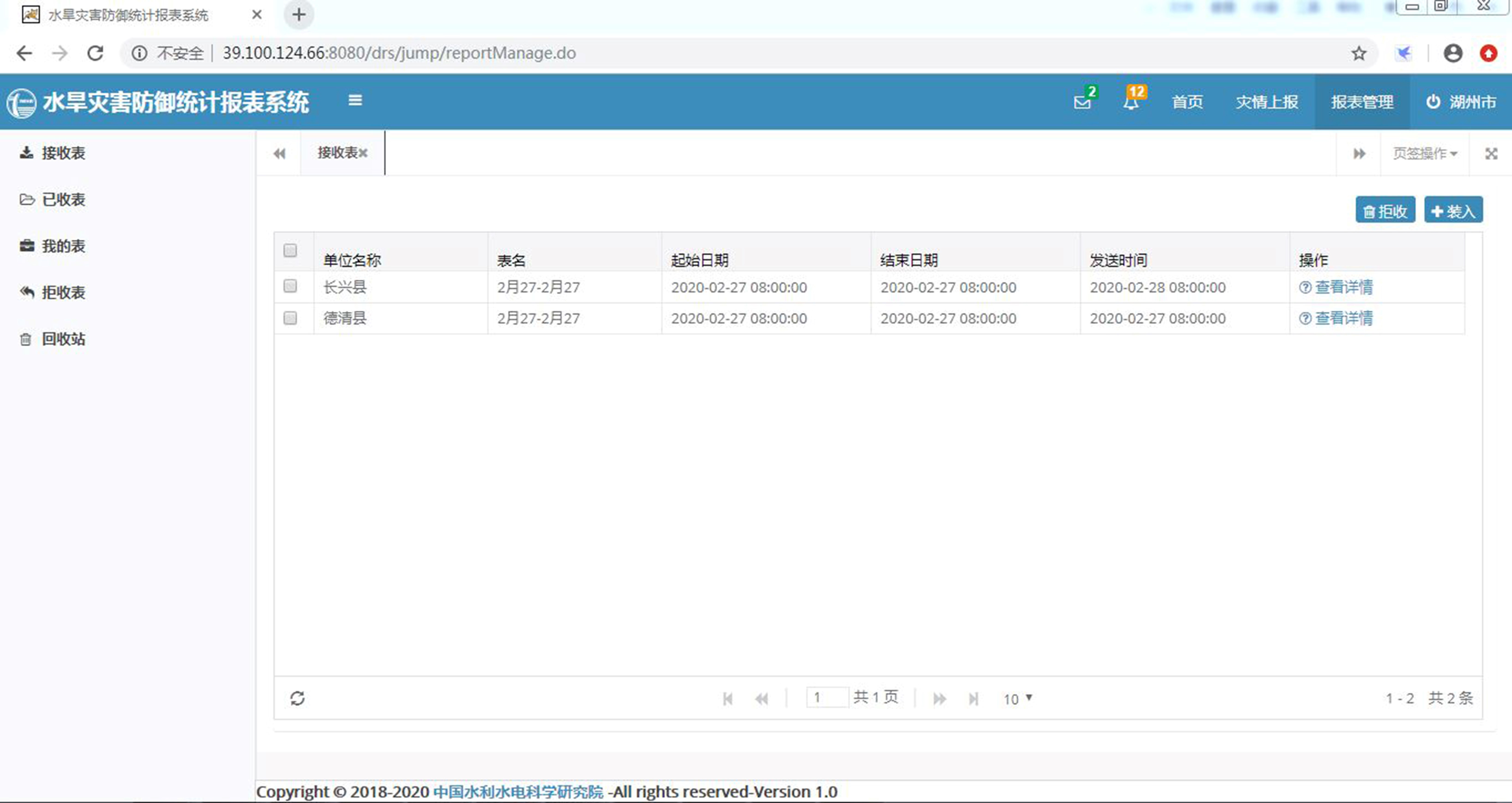 用户接收到下级新报报表时,系统将会发送提示消息,可以点击查看。通过收表箱可以快捷查询所接收到的下级单位报送的报表,可以直接打开查看,并根据实际情况选择接收或拒收。