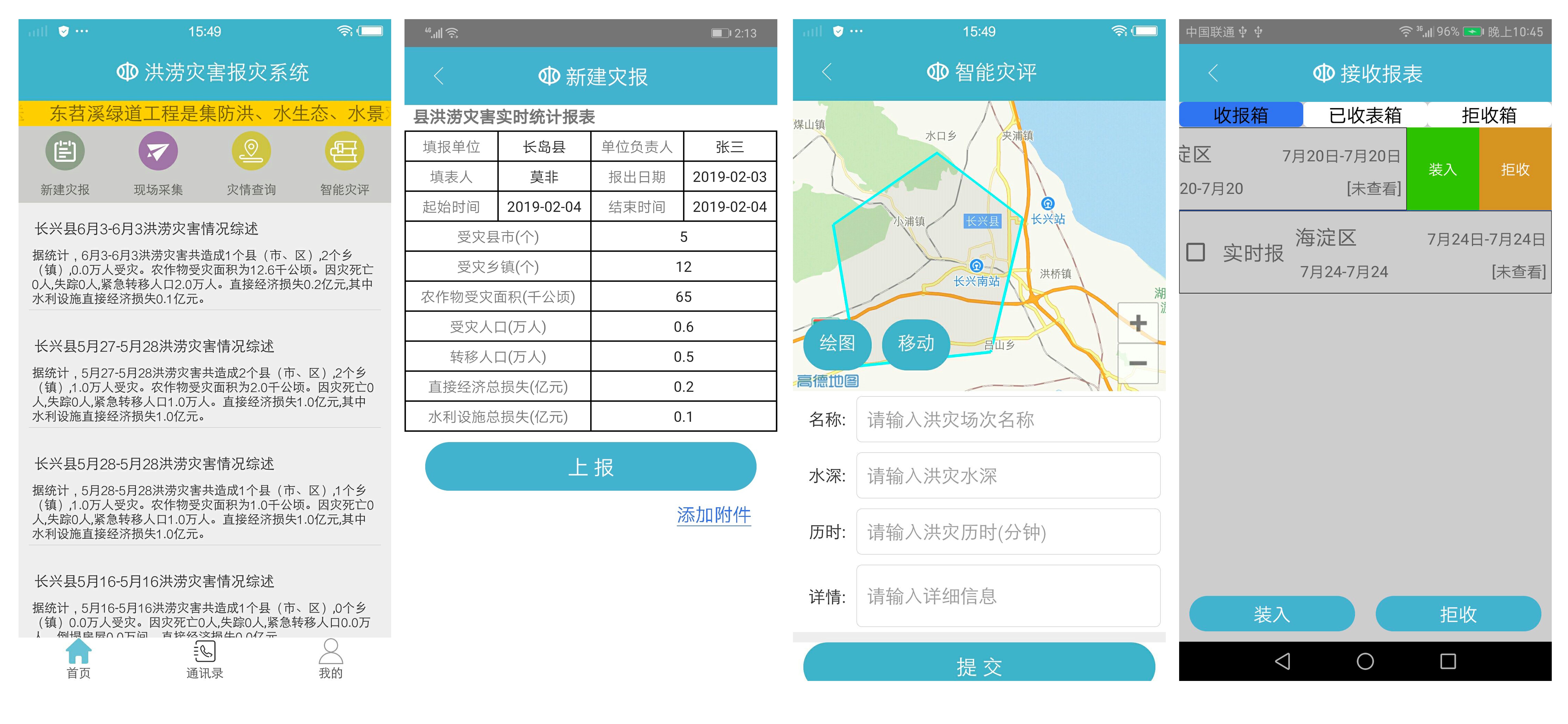 用户通过移动端可以接受查看最新推送的各类水旱灾害防御简报、填报报表、圈画淹没范围、移动采集灾害现场、接收汇总累积报表数据。
